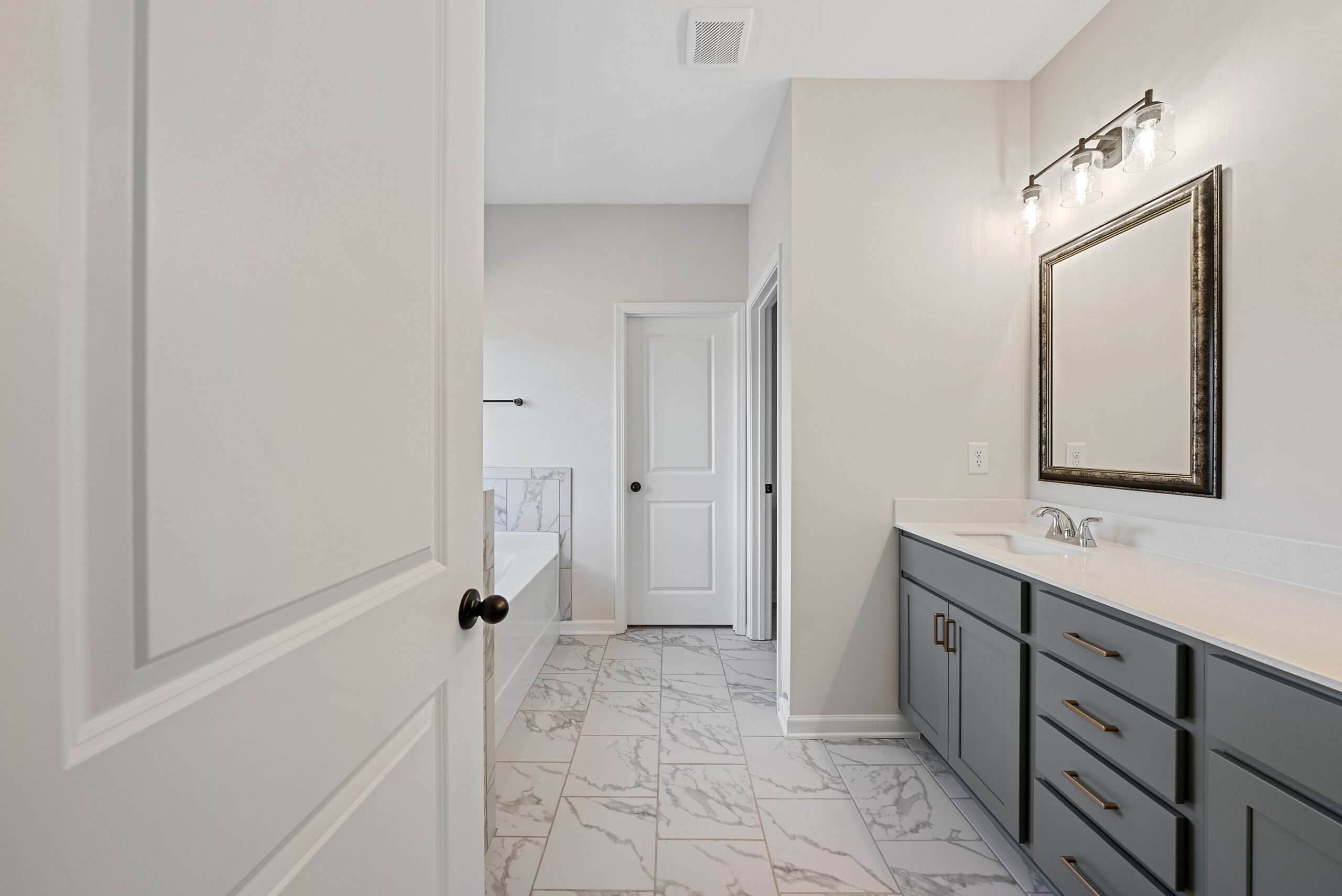 A welcoming entry foyer leads you into a spacious great room, warmed by a cozy fireplace. Unleash your inner chef in the well-appointed kitchen, featuring stylish cabinetry, granite countertops, a designer backsplash, and top-of-the-line stainless steel appliances. A huge island provides ample prep space and casual dining, while a large walk-in pantry ensures organized storage. The convenience continues on the main level with a light-filled owner's suite boasting a luxurious spa bath with a garden tub, double vanity, tiled or fiberglass shower, and spacious walk-in closet. An additional bedroom and full bath, perfect for guests, completes the main level. The owner's entry features our signature drop zone, keeping everyday clutter at bay. Upstairs, two generously sized bedrooms with ample closet space, conveniently located near a full bath. Two car garage and our signature gameday patio with outdoor fireplace!